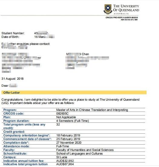 8月27日递交申请,8月30日和31日就收到了西悉尼大学和昆士兰大学的Full Offer,下录取非常快,也得益于我们给学生规划的充分和针对性强