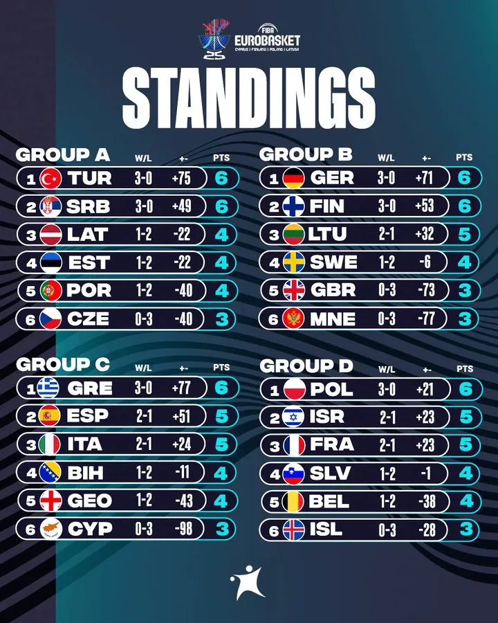 目前已经有6支球队提前进入下一轮,分别是土耳其、塞尔维亚、德国、芬兰、希腊、波兰。