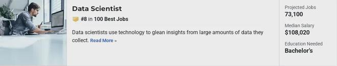 美国劳工统计局数据显示,2024年数据科学家年薪中位数为112,590美元,至2033年,预计新增73,100个岗位。