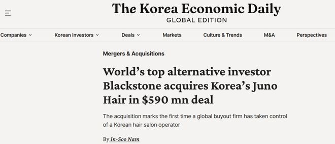 此前,聚美丽曾报道全球知名投资公司、美国私募股权公司黑石集团(下称:Blackstone)拟以5.9亿美元(约合人民币42.14亿元),收购韩国最大高级沙龙连锁店Juno Hair(),如今,这一收购已尘埃落定。