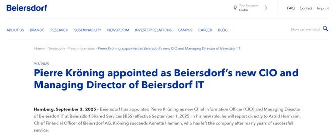 先来看第一则人事任命,据拜尔斯道夫官网显示,Pierre Kröning接替Annette Hamann,担任首席信息官(CIO)兼IT董事总经理及共享服务(BSS),任期将于2025年9月1日生效。在新职位中,其将直接向首席财务官Astrid Hermann汇报拜尔斯道夫股份公司。