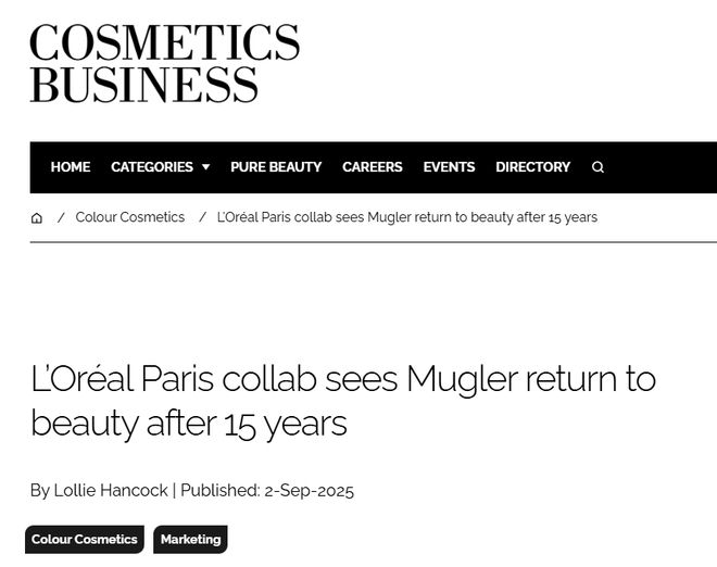 据cosmeticsbusiness报道,法国奢侈时装品牌Mugler在时隔15年后重返美容领域,与巴黎欧莱雅合作推出了新的彩妆系列。