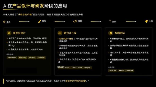 比如在原型和设计阶段,作为一个产品经理以前可能要画很多原型图,甚至一些工业产品可能还要做样机,但现在因为有AI工具的出现,几分钟就可以生成一个可交互的原型,进而去做出迭代反馈。