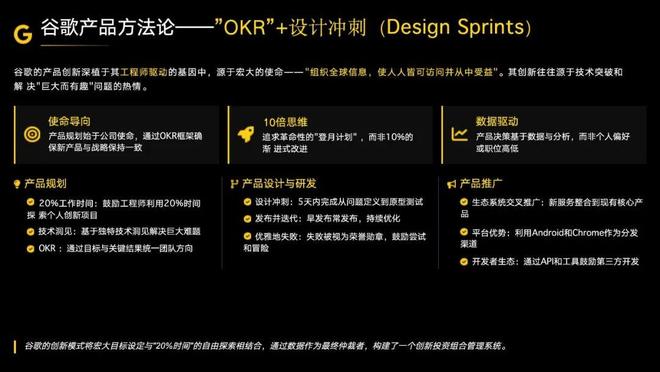 谷歌的OKR体系能够保证其开发的产品都和它最高的使命对齐,其创新往往源于技术突破和解决“巨大而有趣”问题的热情。