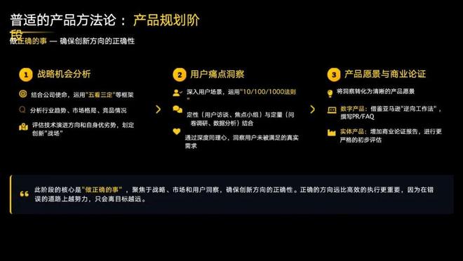 这一阶段最重要的就是做正确的事,确保创新方向的正确性。无论做什么产品,一开始就要尽量确保它是对的。