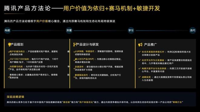 而在产品设计和研发阶段,腾讯较早便引入了敏捷开发,然后通过小步快跑、快速迭代的方式,强调要先做出来一个最小可行产品(MVP),然后再快速根据反馈进行迭代。