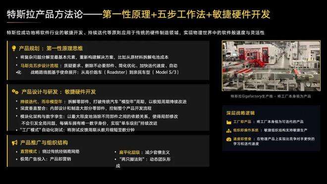 马斯克的第一性原理和五步工作法是混沌同学较为熟悉的内容,这里不多做解释。至于敏捷硬件开发,它的意思是将整车拆分成多个零部件,这在很大程度上消除了不同硬件之间的依赖关系,然后对每个零部件单独进定迭代,进而打破了传统汽车的“模型年”周期,大大提高了迭代速度。