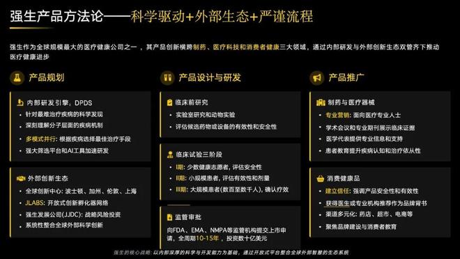 强生作为全球规模最大的医疗健康公司之一 ,其产品创新横跨制药、医疗科技和消费者健康三大领域。它的行业决定了其产品容错率非常之低,因此,它的产品创新路径非常之严谨,大家可以通过下图做一了解。