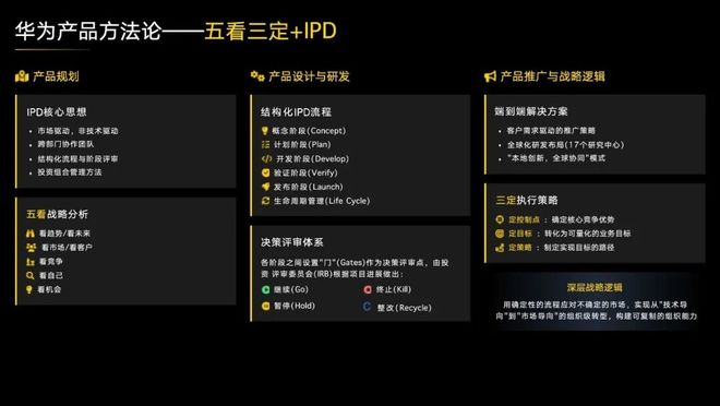 在整个产品开发管理上是华为知名的IPD体系,IPD整体包括了6个阶段,且每个阶段之间都有一个决策评审点。只有通过评审,才能进行下一步的发展,如果评审不通过,那么就不会再推进后续的流程。这点也是华为较为成体系的一个产品创新方法。